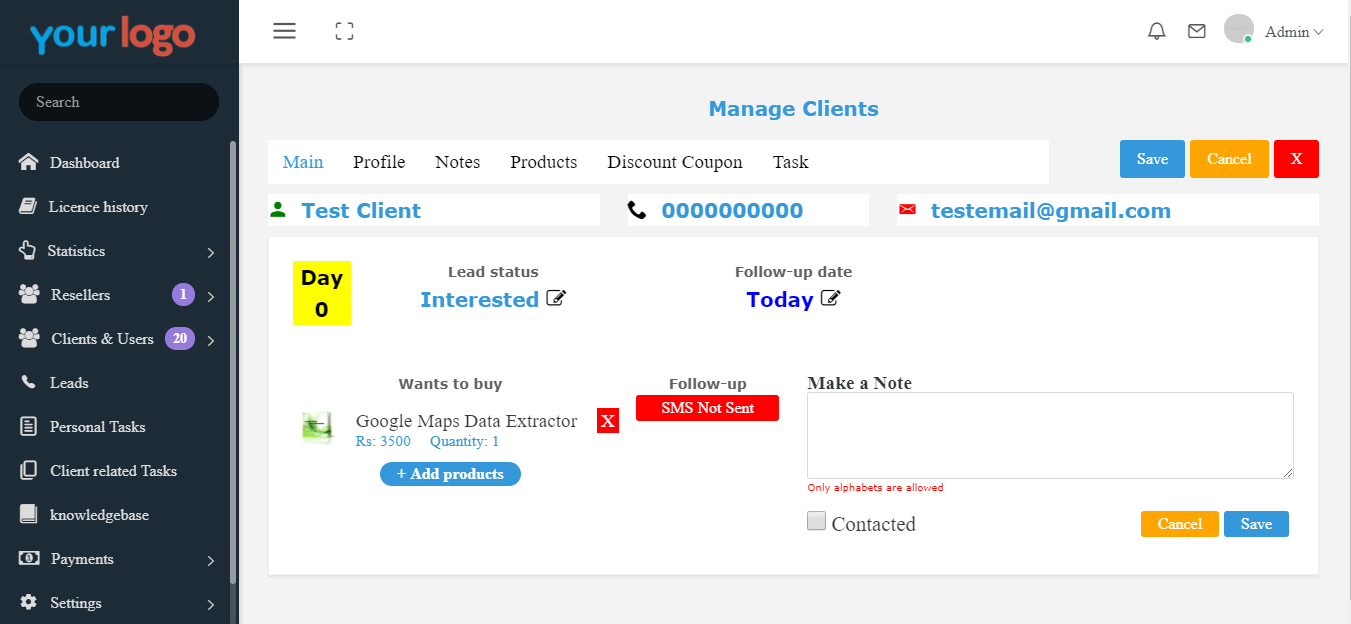 The admin panel comes with inbuilt CRM that will help you manage your clients and resellers. it also allows you to send reminder message on a click of a button.
